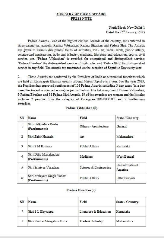 पद्म पुरस्कारों की घोषणा, मुलायम सिंह को पद्म विभूषण, CG की इन 3 हस्तियों को पद्मश्री, देखिए सूची