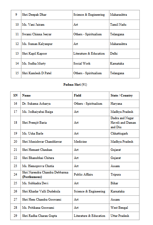 गणतंत्र दिवस की पूर्व संध्या पर सरकार ने प्रतिष्ठित पद्म पुरस्कारों का ऐलान कर दिया है। राष्ट्रपति ने 106 पद्म पुरस्कारों को प्रदान करने की मंजूरी दी है। जिसमें 6 पद्म विभूषण, 9 पद्म भूषण और 91 पद्मश्री शामिल हैं।