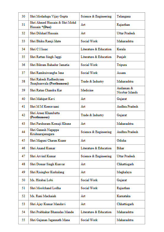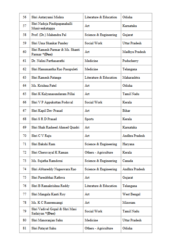 पद्मश्री हासिल करने वाली प्रमुख हस्तियों में चिकित्सा के क्षेत्र में अहम योगदान देने वाले डॉक्टर रतन चंद्र कार और डॉक्टर मुनीश्वर चंद्र दावार और समाजसेवी हीराबाई लोबी शामिल हैं। उनके अलावा नगा समाजसेवी रामकुईबांवे नेवमे, वीपी अप्पुकुट्टन पोडुवाल, एससी शेखर, जीव कल्याण के क्षेत्र में सक्रिय वेदिवेल गोपाल व मोसी सदाइयन, जैविक खेती के प्रेरक तुलाराम उपरेती तथा नेकराम शर्मा भी हैं। जनुम सिंह साय, धनीराम टोटो, बी बालकृष्ण रेड्डी, अजय कुमार मंडावी, रानी मचैया, केसी रुनरेमसांगी, रिसिंगबोर कुरकलांग, मंगला कांति रॉय, मोआ सुबोंग, मुनीवेनकटप्पा, डोमार सिंह कुंवर, परसुराम कोमाजी खुने, गुलाम मोहम्मद ज़ाज, भानुबाई चितारा, परेश राठवा, कपिल देव प्रसाद को भी पद्मश्री के लिए चुना गया हैं।