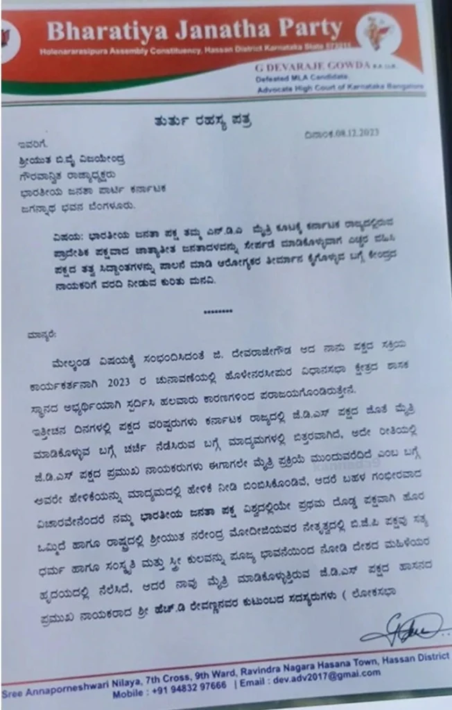 मीडिया रिपोर्ट्स के मुताबिक साल 2023 कर्नाटक विधानसभा चुनाव में होलनरसीपुरा सीट से बीजेपी उम्मीदवार रहे देवराज गौड़ा ने पार्टी के प्रदेश अध्यक्ष बीवाई विजयेंद्र को पत्र लिखा था। रिपोर्ट में कहा गया है कि बीजेपी नेता ने जो पत्र लिखा था, उसमें उन्होंने कहा था, “जेडीएस के एनडीए उम्मीदवार प्रज्वल रेवन्ना समेत एचडी देवगौड़ा परिवार के कई नेताओं के खिलाफ गंभीर आरोप लगे हैं।”