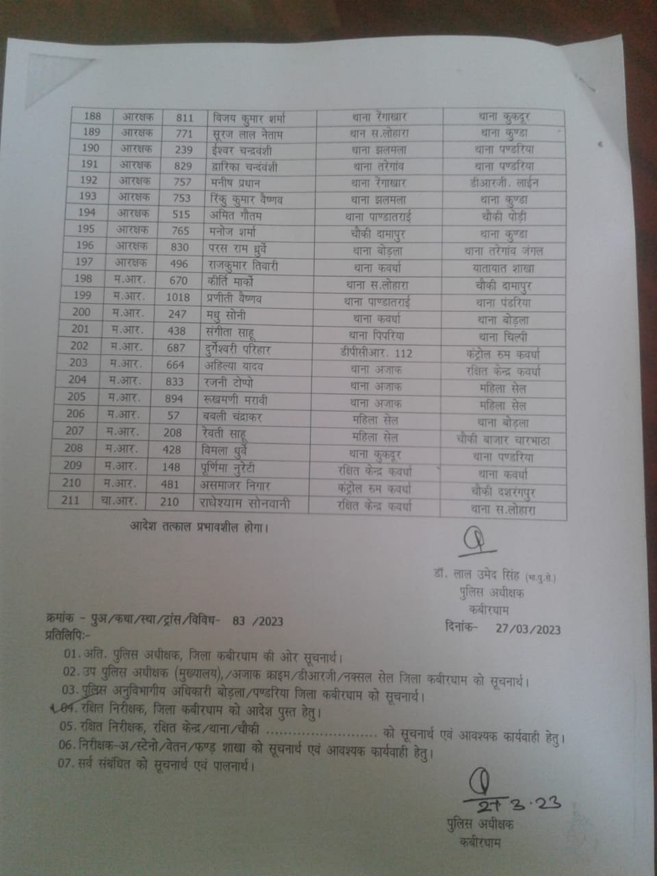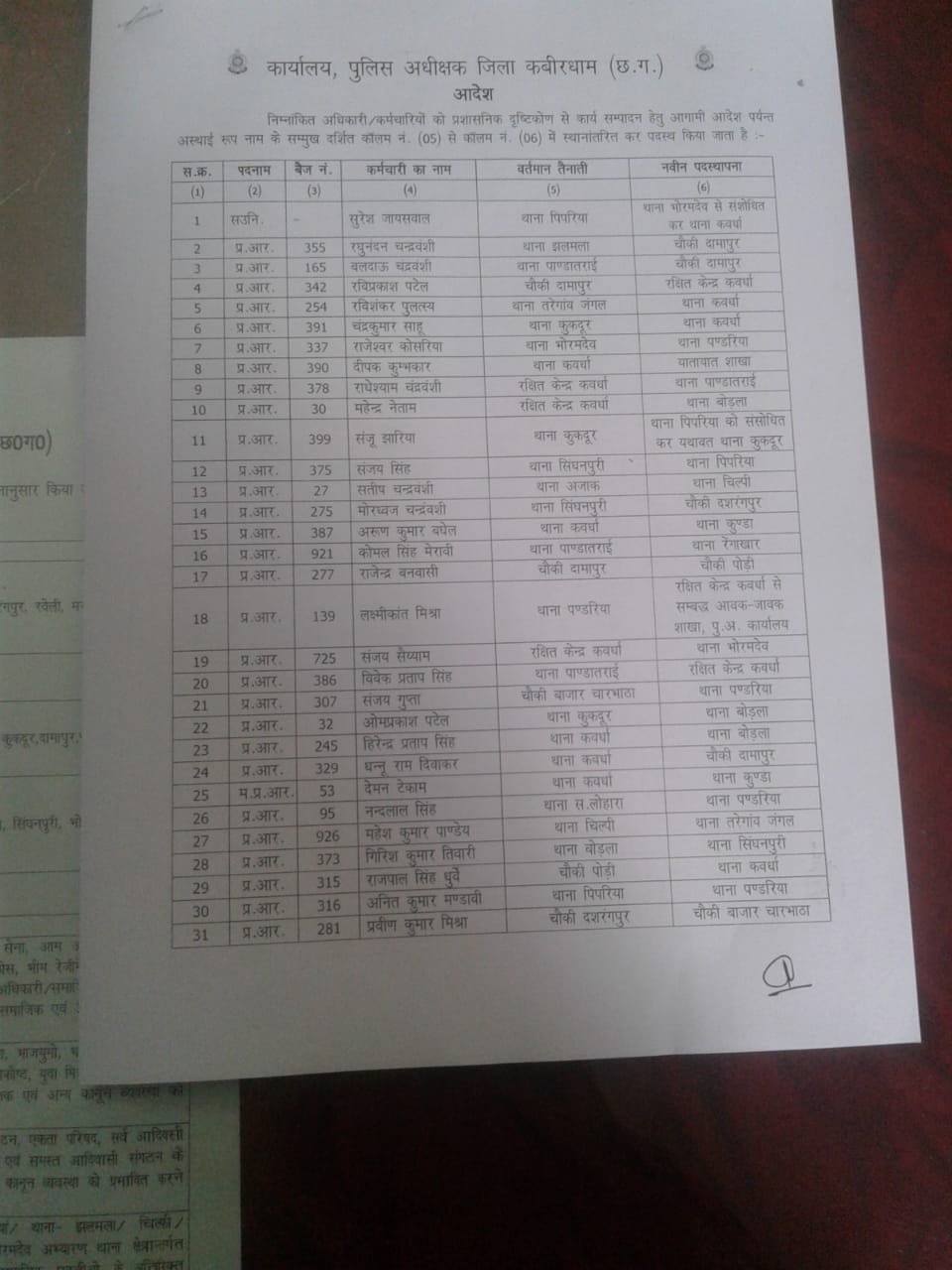 छत्तीसगढ़ के कबीरधाम जिले के पुलिस विभाग में बड़े पैमाने पर फेरबदल हुआ है। यहां एक साथ 211 पुलिस कर्मियों का तबादला किया गया है। जिनमें 35 हेड कांस्टेबल और 176 कांस्टेबल शामिल हैं। SP डॉ लाल उमेंद सिंह ने इसे लेकर आदेश जारी किया है।