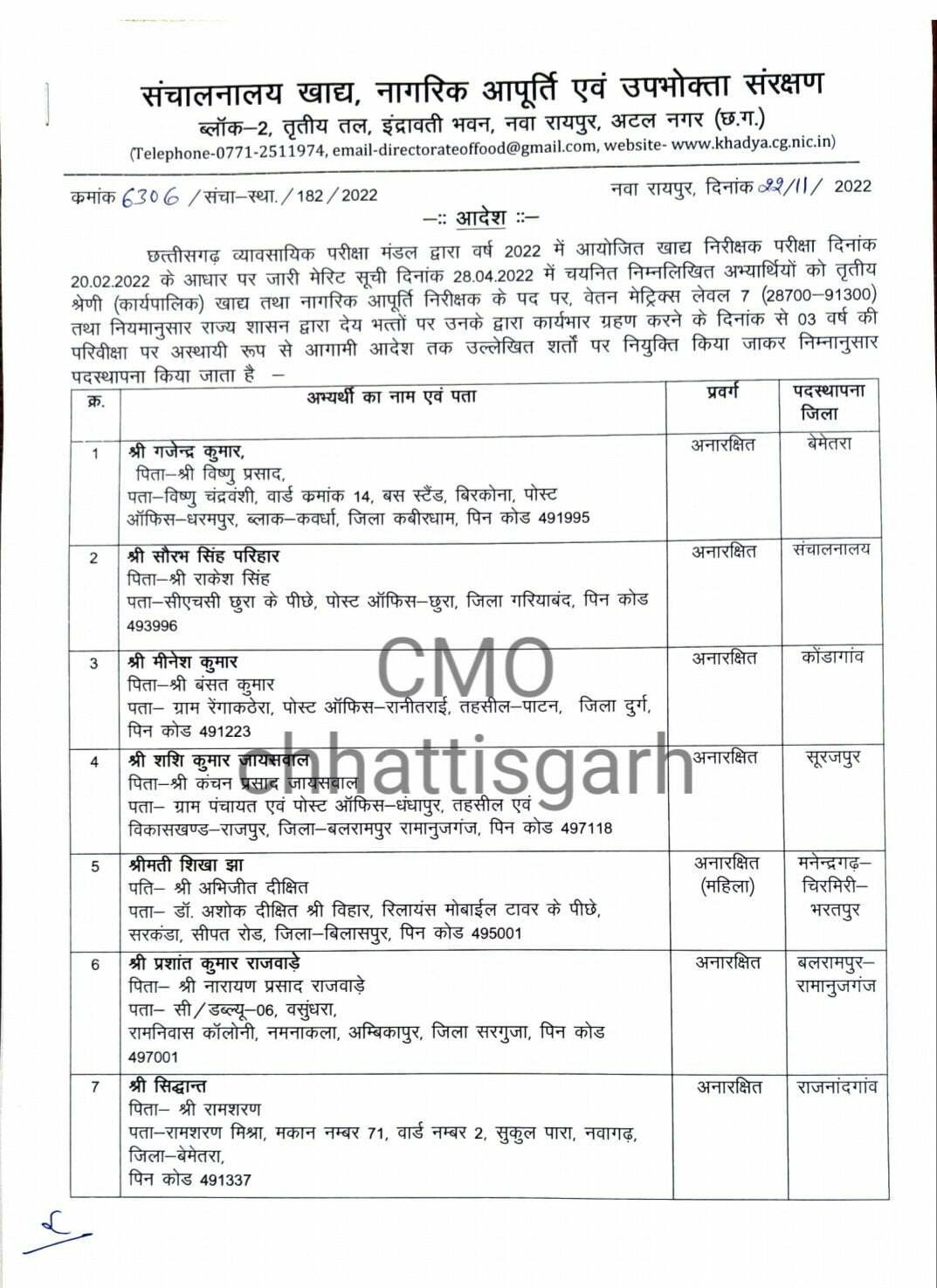 22/11/2022 Posting Breaking : राज्य सरकार ने खाद्य निरीक्षकों का पोस्टिंग ऑर्डर किया जारी, देखिए सूची Admin September 26, 2022 राज्य सरकार ने खाद्य निरीक्षकों की भर्ती में पास हुए 74 उम्मदवारों की पदस्थापना आदेश जारी किया है। चयनित सभी अभ्यर्थी 3 साल के प्रोबेशन पीरियड पर कार्य करेंगे।देखिए लिस्ट Related News: BREAKING: संतराम नेताम विधानसभा उपाध्यक्ष निर्विरोध निर्वाचित, जानें कैसा रहा पुलिस से लेकर राजनीति तक का सफर BIG BREAKING: CG के नेता प्रतिपक्ष नारायण चंदेल के बेटे पर दुष्कर्म का केस दर्ज, जानिए पूरा मामला Video: बागेश्वर धाम के धीरेन्द्र कृष्ण शास्त्री को अब शंकराचार्य ने दी चुनौती, जानिए क्या कहा Tags cg food inspector cg vyapam food inspector exam Food Inspector posting food inspector vaccancy posting order vyapam
