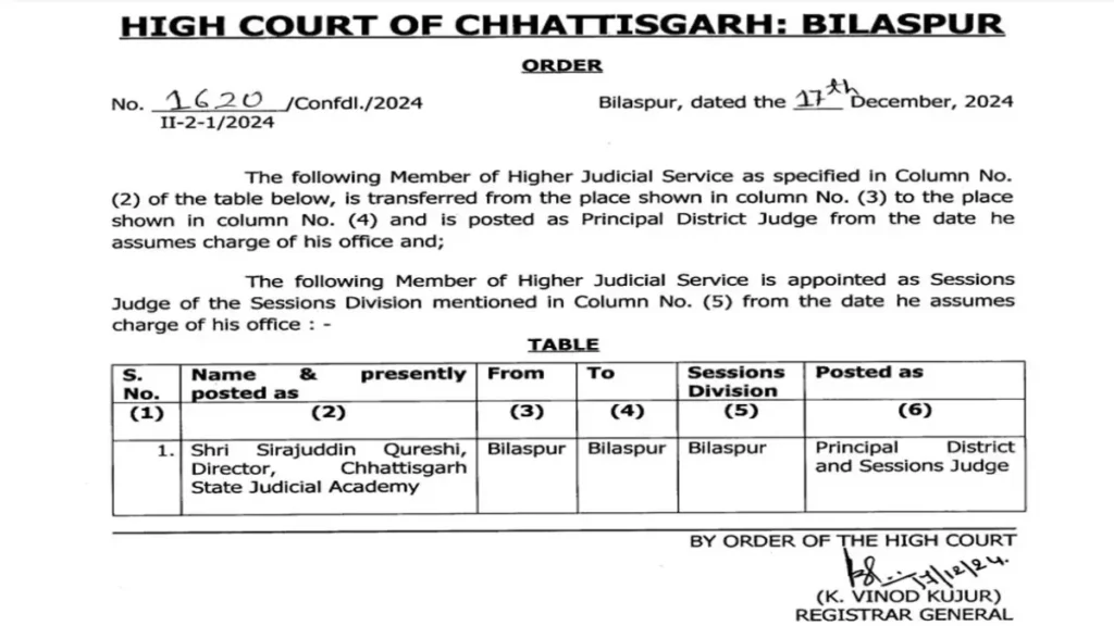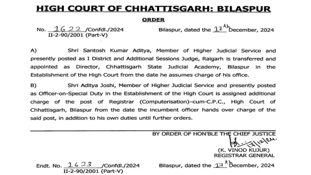 रायगढ़ के डिस्ट्रिक्ट एंड एडिशनल सेशन जज संतोष कुमार आदित्य को छत्तीसगढ़ स्टेट जुडिशियल अकाडमी बिलासपुर का डायरेक्टर बनाया गया है। छत्तीसगढ़ स्टेट जुडिशियल अकाडमी बिलासपुर के डायेक्टर सिराजुद्दीन कुरैशी को प्रधान जिला एवं सत्र न्यायाधीश बनाया गया है।