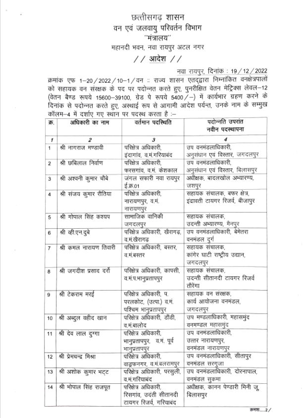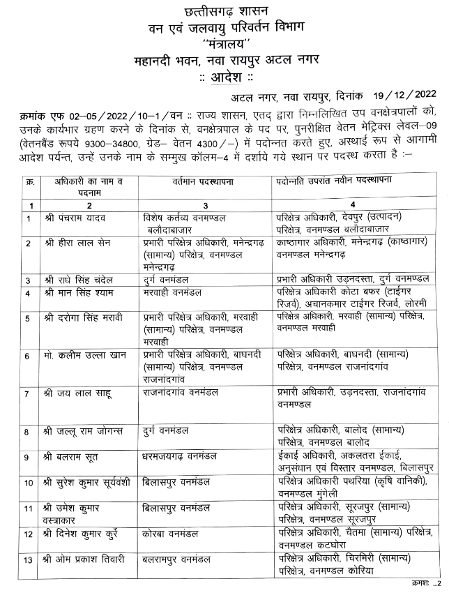 राज्य सरकार ने एक बार फिर बड़े पैमाने पर प्रमोशन और पोस्टिंग आदेश जारी किया है। सरकार ने वन विभाग में वन विभाग में पदस्थ डिप्टी रेंजरों का रेंजर पद पर प्रमोशन किया है। वहीं वन क्षेत्रपालों का वन सहायक संरक्षक के पद पर प्रमोशिन किया है।