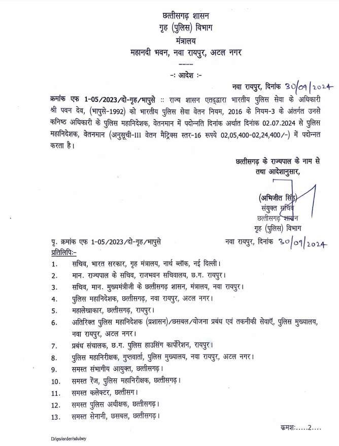 Promotion Breaking: सीनियर IPS पवन देव बनाए गए DG, आदेश जारी