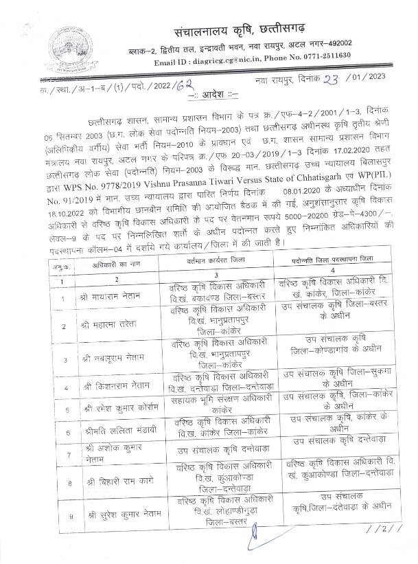 23/01/2023 Promotion Posting Breaking: CG में इस विभाग में बड़े पैमाने पर अधिकारियों के हुए प्रमोशन, मिली नई पोस्टिंग Admin September 26, 2022 छत्तीसगढ़ में कृषि विभाग में बड़े पैमाने पर अधिकारियों का प्रमोशन हुआ है। अधिकारियों के प्रमोशन के साथ ही उन्हें नई पोस्टिंग दी गई है।देखिए आदेश Related News: मानसून देगा गर्मी से जल्द राहत, समय से पहले बरसेंगे बदरा, जानिए किस राज्य में कब होगी बारिश नक्सली हमले: इंटेलीजेंस फेल्योर से 17 साल में 550 से ज्यादा की दर्दनाक मौत, जानें पूरी डिटेल CG आरक्षण: सुप्रीम कोर्ट ने 58 % आरक्षण पर लगी रोक हटाई, भर्ती प्रमोशन शुरु करने के दिए निर्देश