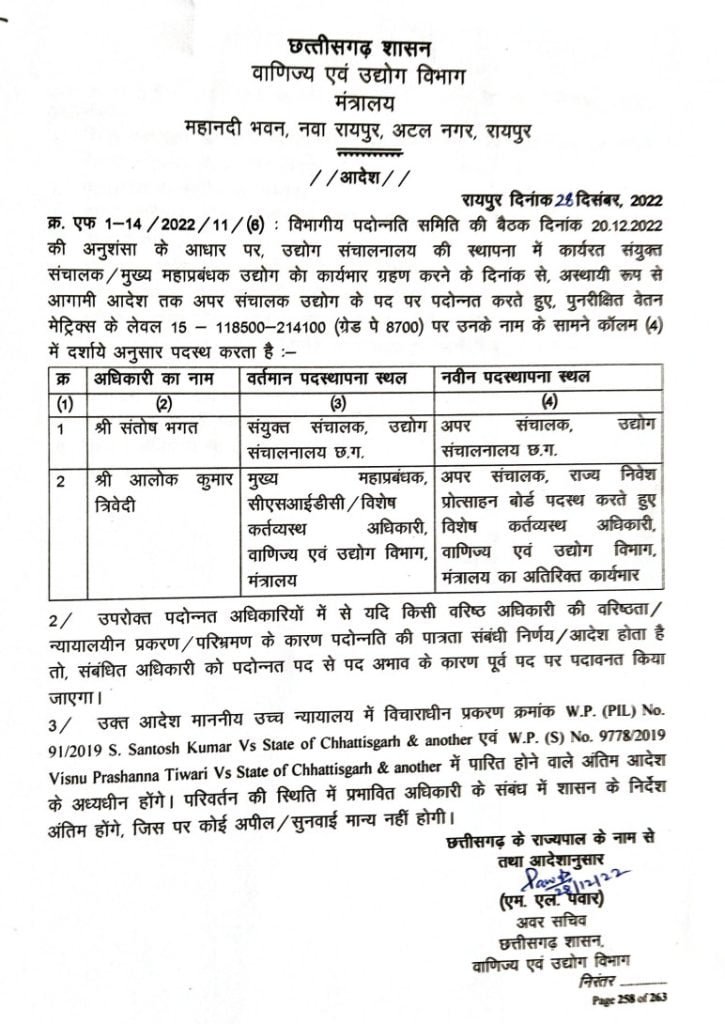 राज्य सरकार ने वाणिज्य और उद्योग विभाग के अधिकारियों का प्रमोशन और तबादला आदेभी जारी किया है। संयुक्त संचालक, संचालनालय संतोष भगत को अपर संचालक बनाया गया है। सीएसआईडीसी मुख्य महाप्रबंधक औऱ ओेसडी वाणिज्य एवं उद्योग विभाग आलोक त्रिवेदी को अपर संचालक राज्य निवेश प्रोत्साहन बोर्ड में पदस्थ किया गया है। उनके पास वाणिज्य एवं उद्योग विभाग के ओएसडी का अतरिक्त प्रभार भी रहेगा।
