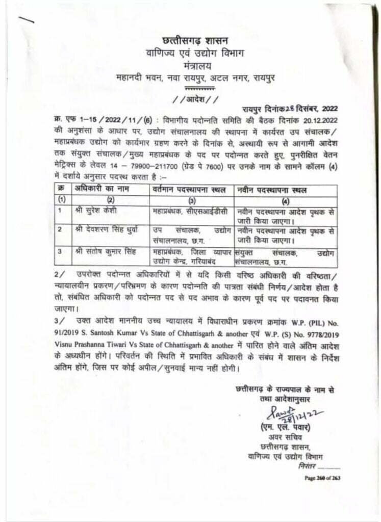 इसके साथ ही महाप्रबंधक सीएसआईडीसी सुरेश केसी और उप संचालक उद्योग संचालनालय देवशरण सिंह धुर्वा का भी तबादला आदेश जारी किया है लेकिन उनकी नवीन पदस्थापना बाद में जारी की जाएगी। वहीं महाप्रबंध जिला व्यापार एवं उद्योग केन्द्र गरियाबंद संतोष सिंह को संयुक्त संचालक, उद्योग संचालनालय बनाया गया है।