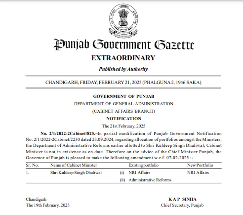 धालीवाल को प्रशासनिक सुधार विभाग और NRI मामलों का मंत्री बनाया गया था। जो कि अस्तित्व में ही नहीं था। पंजाब के मुख्य सचिव ने एक गजट अधिसूचना जारी कर कहा है कि विभाग को खत्म करने का फैसला मुख्यमंत्री भगवंत मान की सलाह पर लिया गया है। गजट के मुताबिक कैबिनेट मंत्री कुलदीप सिंह धालीवाल को पहले आवंटित प्रशासनिक सुधार विभाग आज की तारीख में अस्तित्व में नहीं है। धालीवाल के पास अब सिर्फ NRI मामलों का विभाग रहेगा।