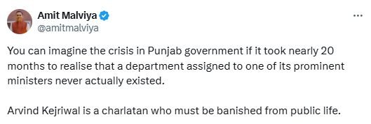 वहीं बीजेपी आईटी सेल के प्रमुख अमित मालवीय ने कहा, “आप पंजाब सरकार के संकट की कल्पना कर सकते हैं यदि उसे यह महसूस करने में लगभग 20 महीने लग गए कि उसके प्रमुख मंत्रियों में से एक को सौंपा गया विभाग वास्तव में कभी अस्तित्व में ही नहीं था।