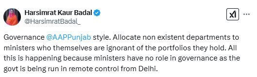 इस गजट नोटिफिकेशन के बाद राज्य की आप सरकार विपक्ष के निशाने पर आ गई है। अकाली दल की सांसद और पूर्व केंद्रीय मंत्री हरसिमरत कौर बादल ने कहा, “मंत्रियों को वो विभाग आवंटित करना, जो अस्तित्व में ही नहीं हैं। जिन्हें खुद नहीं पता कि उनके पास कौन से विभाग हैं। यह सब इसलिए हो रहा है, क्योंकि मंत्रियों की शासन में कोई भूमिका नहीं है। दिल्ली से रिमोट कंट्रोल से सरकार चल रही है।”