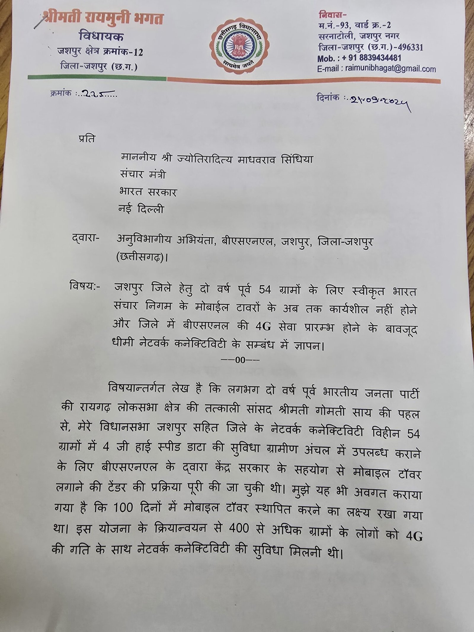 विधायक रायमुनि भगत ने केंद्रीय दूरसंचार मंत्री ज्योतिरादित्य सिंधिया को चिट्ठी लिखी है। जिसमें उन्होंने नेटवर्क की समस्या का जिक्र किया है। पत्र में रायमुनी भगत ने लिखा है कि करीब 2 साल पहले तत्कालीन सांसद गोमती साय की पहल पर 54 टावर लगाने और 4G नेटवर्क की कवायद शुरू हुई थी। इसके लिए टेंडर का काम पूरा हो चुका है। 100 दिन में मोबाइल टावर स्थापित करने का लक्ष्य था। लेकिन इसे अब तक पूरा नहीं किया गया।