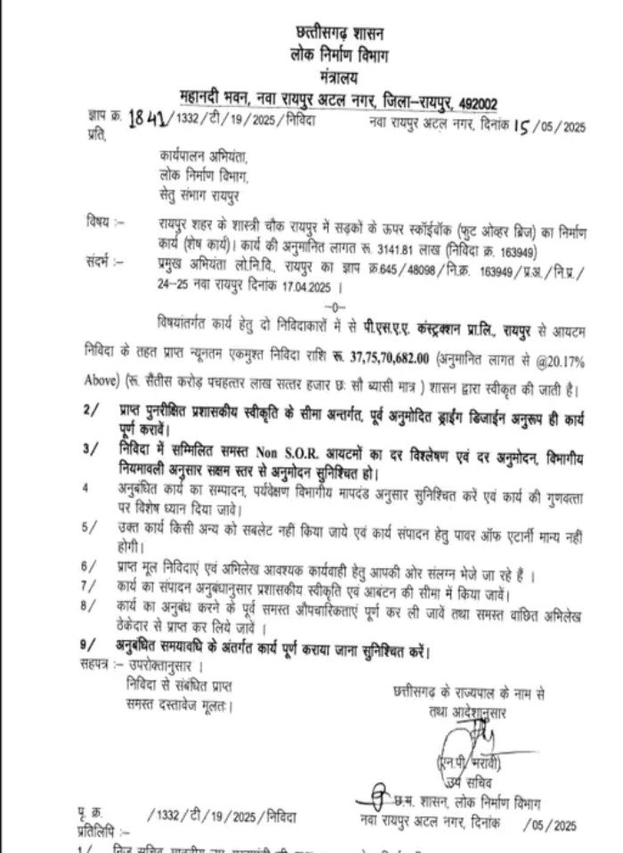 छत्तीसगढ़ की राजधानी रायपुर के बहुचर्चित और विवादित स्काई-वॉक प्रोजेक्ट को पूरा करने के लिए लोक निर्माण विभाग (PWD) ने नई शुरुआत की है। करीब 8 साल से अधूरे पड़े इस ढांचे के लिए 37 करोड़ 75 लाख 70 हजार 682 रुपये की राशि मंजूर की गई है, जो पहले के अनुमान से 20.17% अधिक है। PWD ने टेंडर प्रक्रिया पूरी कर पीएसएस कंस्ट्रक्शन प्रा. लि. रायपुर को निर्माण का जिम्मा सौंपा है।