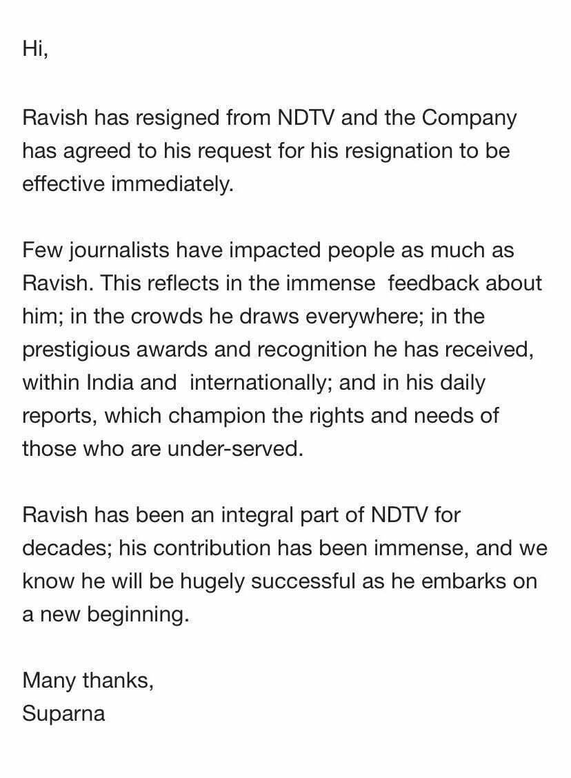 प्रणय रॉय और उनकी पत्नी राधिका रॉय के बाद NDTV से अब रवीश कुमार ने भी इस्तीफा दे दिया है। वे एनडीटीवी में प्राइम टाइम, रवीश कुमार की रिपोर्ट सहित कई शो को होस्ट किया करते थे। चैनल ने रवीश कुमार के जाने की घोषणा करते हुए एक इंटरनल मेल किया है और कहा कि उनका इस्तीफा तत्काल रुप से प्रभावी है।