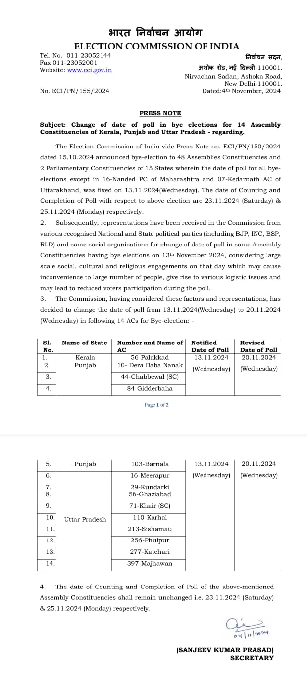 उपचुनाव की तारीख बदली, 13 तारीख को नहीं डाले जाएंगे वोट, अब इस दिन होगा मतदान