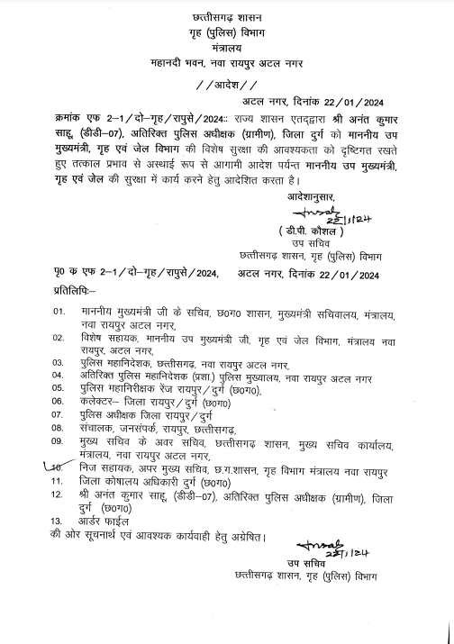 प्रदेश सरकार ने छत्तीसगढ़ के उप मुख्यमंत्री विजय शर्मा की सुरक्षा व्यवस्था को लेकर खास इंतजाम किया है। राज्य शासन ने दुर्ग में पदस्थ अतिरिक्त पुलिस अधीक्षक (ग्रामीण) को उप मुख्यमंत्री की सुरक्षा का जिम्मा सौंपा है।