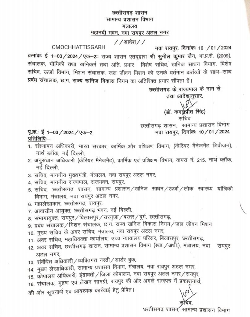 इसके साथ ही IAS अफसर सुनील कुमार जैन को राज्य खनिज विकास निगम के प्रबंध संचालक का अतिरिक्त प्रभार दिया गया है। वर्तमान में खनिज विभाग के संचालक के अलावा खनिज और ऊर्जा विभाग के विशेष सचिव के साथ ही जल जीवन मिशन के मिशन संचालक की भी जिम्मेदारी है।