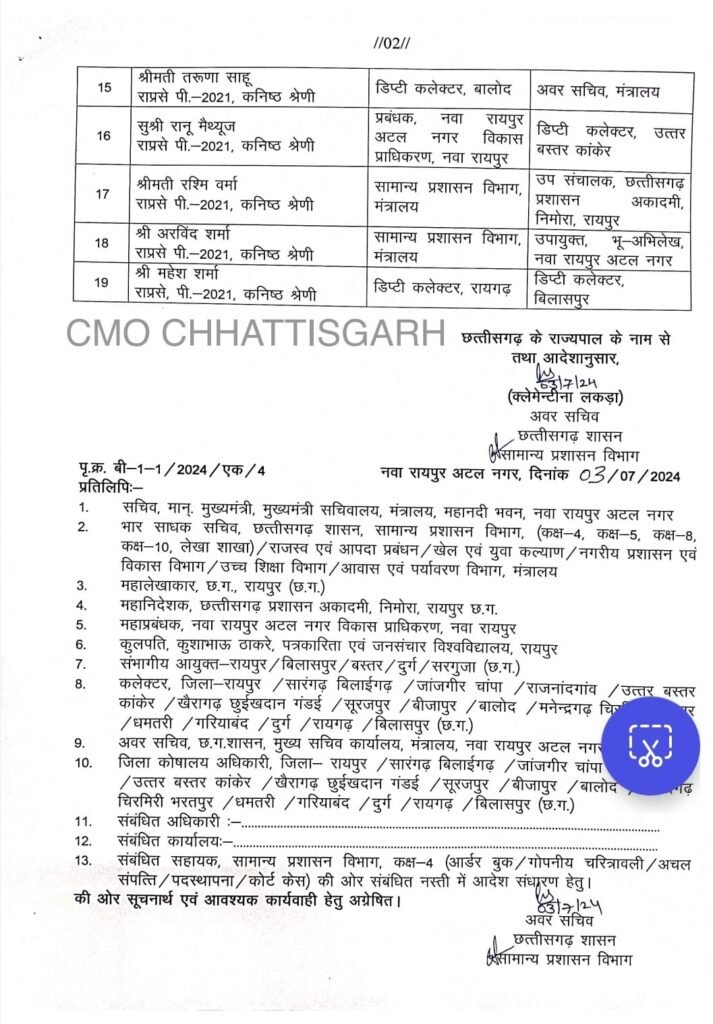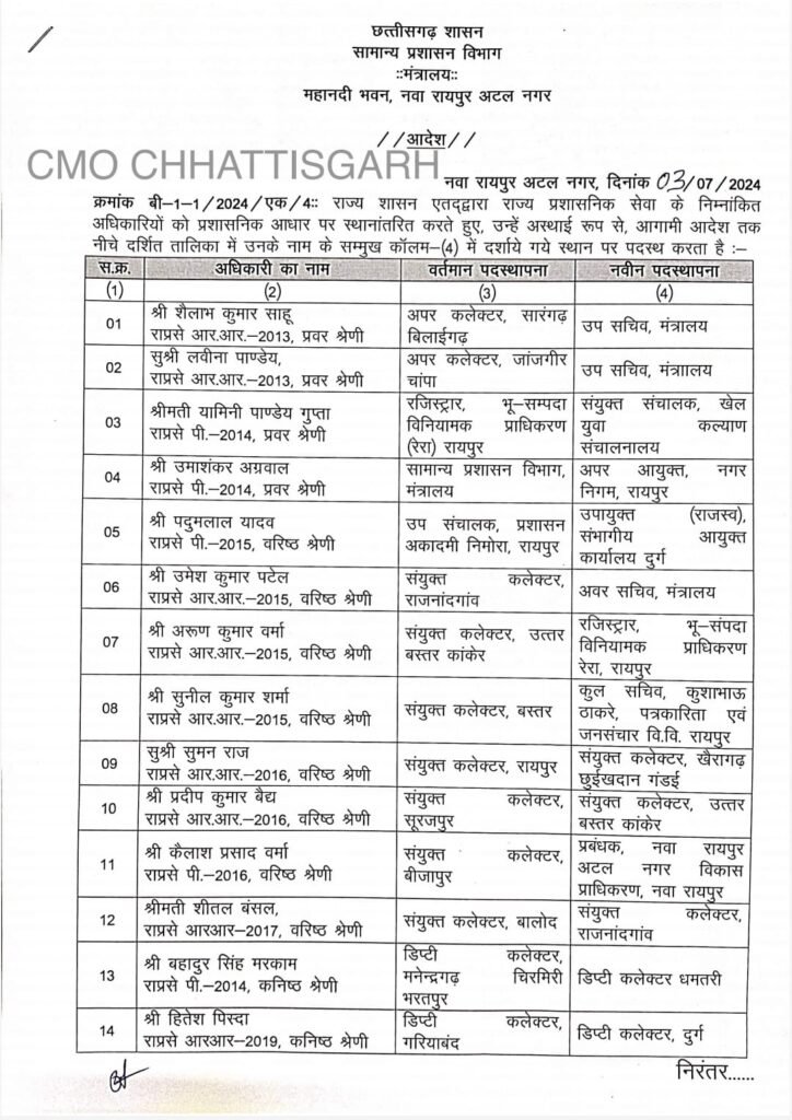 03/07/2024 Transfer: छत्तीसगढ़ में बड़ी प्रशासनिक सर्जरी, कई जिलों के बदले गए अपर और डिप्टी कलेक्टर Admin September 26, 2022 छत्तीसगढ़ में राज्य सरकार ने एक बार फिर प्रशासनिक सर्जरी की है। सरकार ने राज्य प्रशासनिक सेवा के 19 अफसरों का तबादला किया है।देखिए लिस्ट Related News: Big Breaking: नंदकुमार साय कांग्रेस में हुए शामिल, CM भूपेश और मोहन मरकाम ने दिलाई सदस्यता ED Raid: छत्तीसगढ़ में CM के बेहद करीबियों के ठिकानों पर ED का छापा, भूपेश बघेल ने बताया बर्थडे गिफ्ट सीएम भूपेश ने ED, IT और CBI को बताया लोकतंत्र के लिए खतरा, अडानी पर दिया ये सनसनीखेज बयान
