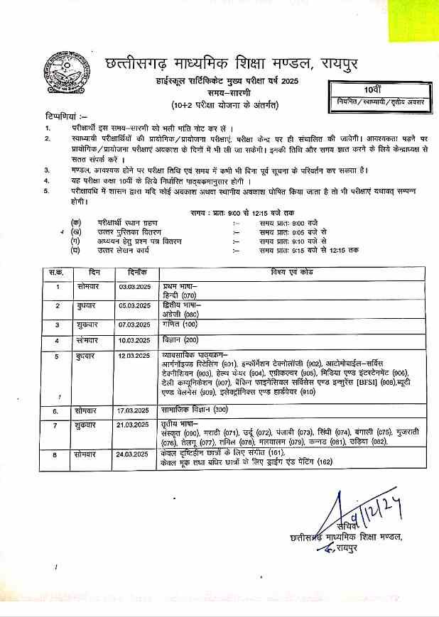 छत्तीसगढ़ माध्यमिक शिक्षा मंडल ने 10वीं और 12वीं बोर्ड परीक्षा की समय सारिणी जारी कर दी है। 10वीं बोर्ड की परीक्षाएं 3 मार्च से 24 मार्च तक होंगी। वहीं 12वीं बोर्ड की परीक्षा 1 मार्च से 28 मार्च तक आयोजित की जाएगी। परीक्षा का समय सुबह 9 बजे से लेकर दोपहर 12:15 बजे तक रखा गया है।