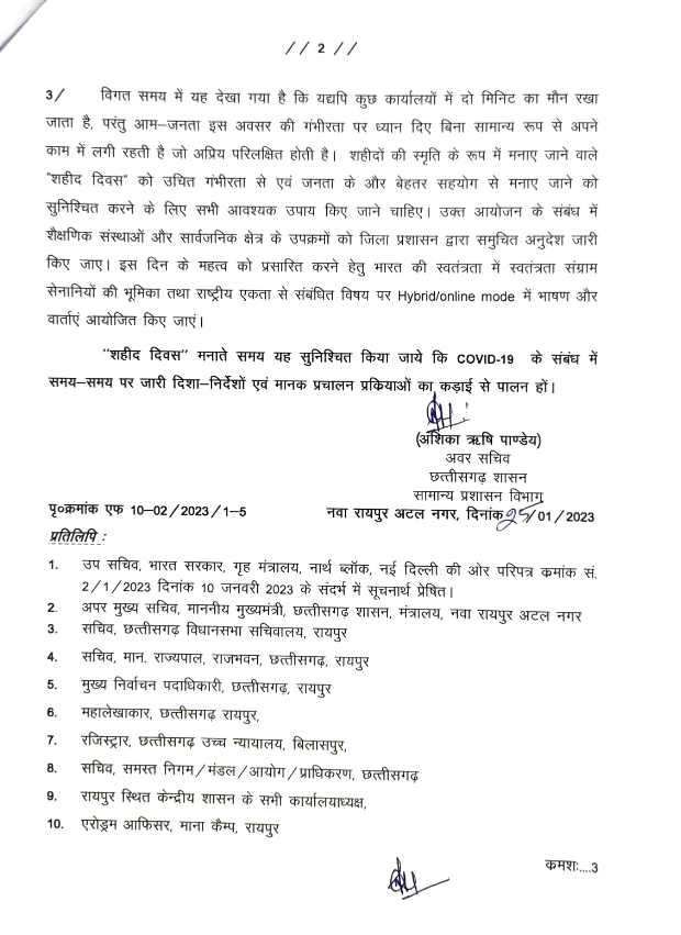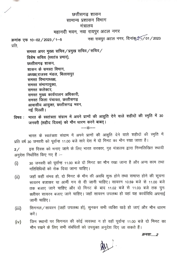 देश की स्वतंत्रता संग्राम में अपने प्राणों की आहूति देने वाले शहीदों की स्मृति में 30 जनवरी को शहीद दिवस का आयोजन किया जा रहा है। सामान्य प्रशासन विभाग ने इसे लेकर सभी विभागों, कलेक्टरों, कमिश्नरों, संभाग आयुक्तों और सभी जिला पंचायत के सीईओ को निर्देश जारी किया है। जिसमें सभी कामकाज और सारी गतिविधियों को रोककर 2 मिनट मौन रखने का निर्देश दिया गया है।