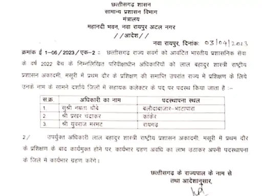 छत्तीसगढ़ में 3 नए ट्रेनी IAS अफसरों को फील्ड पोस्टिंग मिली है। 2022 के IAS अफसरों को अलग-अलग जिलों में सहायक कलेक्टर के फील्ड पोस्टिंग दी गई है। इन अफसरों में नम्रता चौबे को बलौदाबाजार-भाटापारा, प्रखर चंद्राकर को कांकेर और युवराज मरमट को रायगढ़ जिले का सहायक कलेक्टर बनाया गया है।