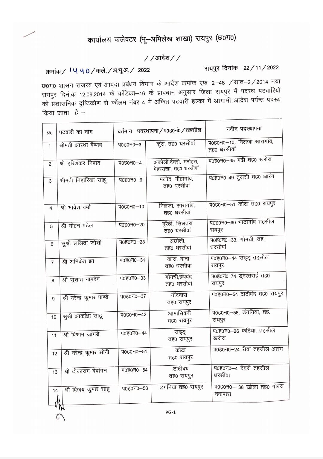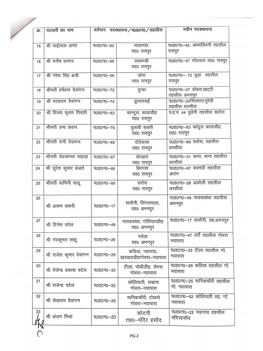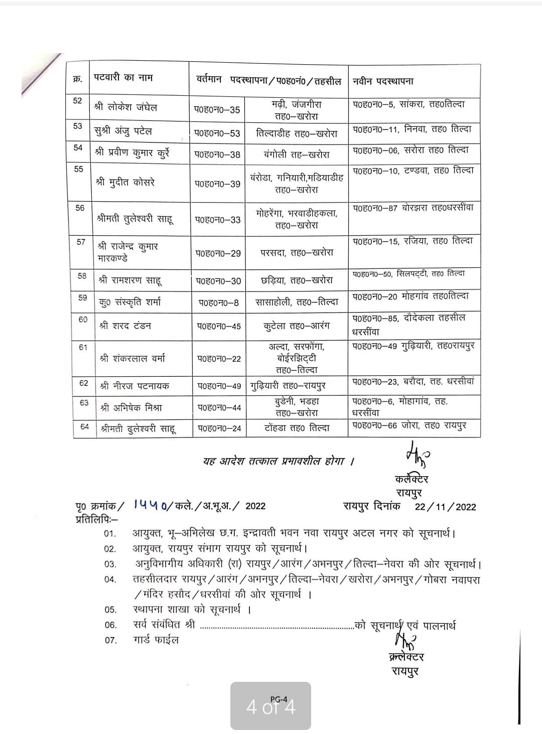 रायपुर। राजधानी रायपुर में लंबे समय से एक ही स्थान पर पदस्थ पटवारियों का कलेक्टर डॉ सर्वेश्वर भुरे ने तबादला किया है।