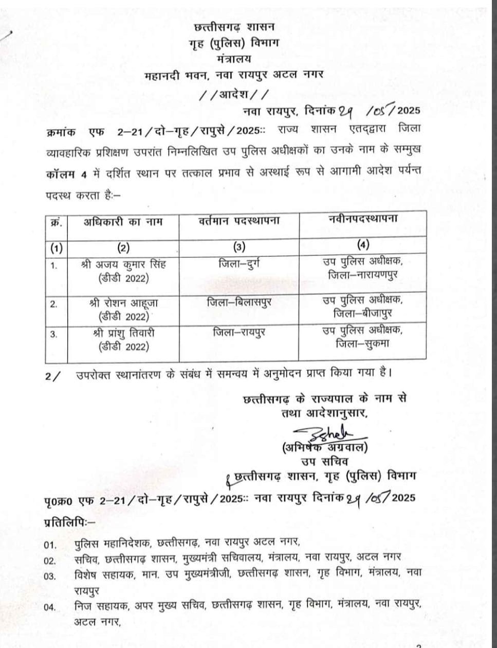 छत्तीसगढ़ के पुलिस महकमे में एक बार फिर तबादला हुआ है। राज्य सरकार ने उप पुलिस अधीक्षकों (DSP) का तबादला किया है। गृह (पुलिस) विभाग द्वारा जारी आदेश में दुर्ग, रायपुर औऱ बिलासपुर के उप पुलिस अधीक्षकों (DSP) का ट्रांसफर किया गया है। जारी आदेश के मुताबिक दुर्ग में पदस्थ डीएसपी अजय कुमार सिंह को नारायणपुर, बिलासपुर के डीएसपी रोशन आहूजा को बीजापुर और रायपुर डीएसपी प्रांशु तिवारी को सुकमा ट्रांसफर कर दिया है।