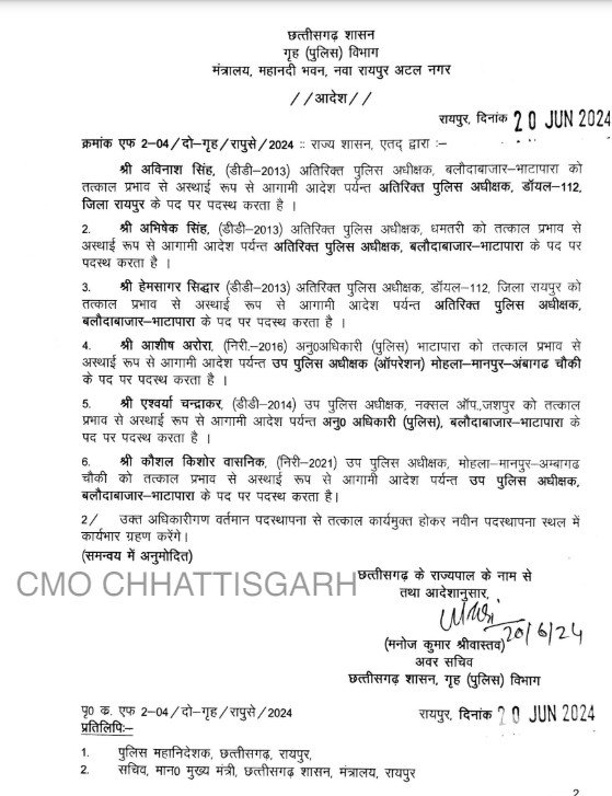 20/06/2024 Transfer: एडिशनल एसपी और डीएसपी रैंक के अफसरों का तबादला, आदेश जारी Admin September 26, 2022 राज्य सरकार ने एडिशनल एसपी और डीएसपी रैंक के तकरीबन आधा दर्जन अफसरों का तबादला आदेश जारी किया है। देखिए सूची Related News: मानसून देगा गर्मी से जल्द राहत, समय से पहले बरसेंगे बदरा, जानिए किस राज्य में कब होगी बारिश नक्सल हमले के बाद CM भूपेश ने रद्द किया कर्नाटक चुनावी दौरा, जवानों को श्रद्धांजलि देने जाएंगे दंतेवाड़ा Big Breaking: नंदकुमार साय कांग्रेस में हुए शामिल, CM भूपेश और मोहन मरकाम ने दिलाई सदस्यता