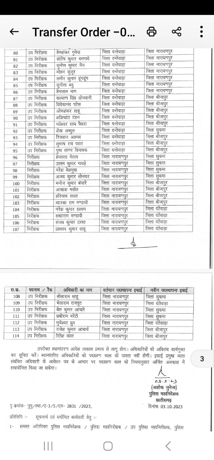 चुनाव से पहले एक बार फिर पुलिस विभाग में बड़े पैमाने पर इंस्पेक्टर और सब इंस्पेक्टर के हुए तबादले हुए हैं। पीएचक्यू ने नक्सली क्षेत्र में तैनात 114 इंस्पेक्टर और सब इंस्पेक्टरों के तबादले का आदेश जारी किया है।